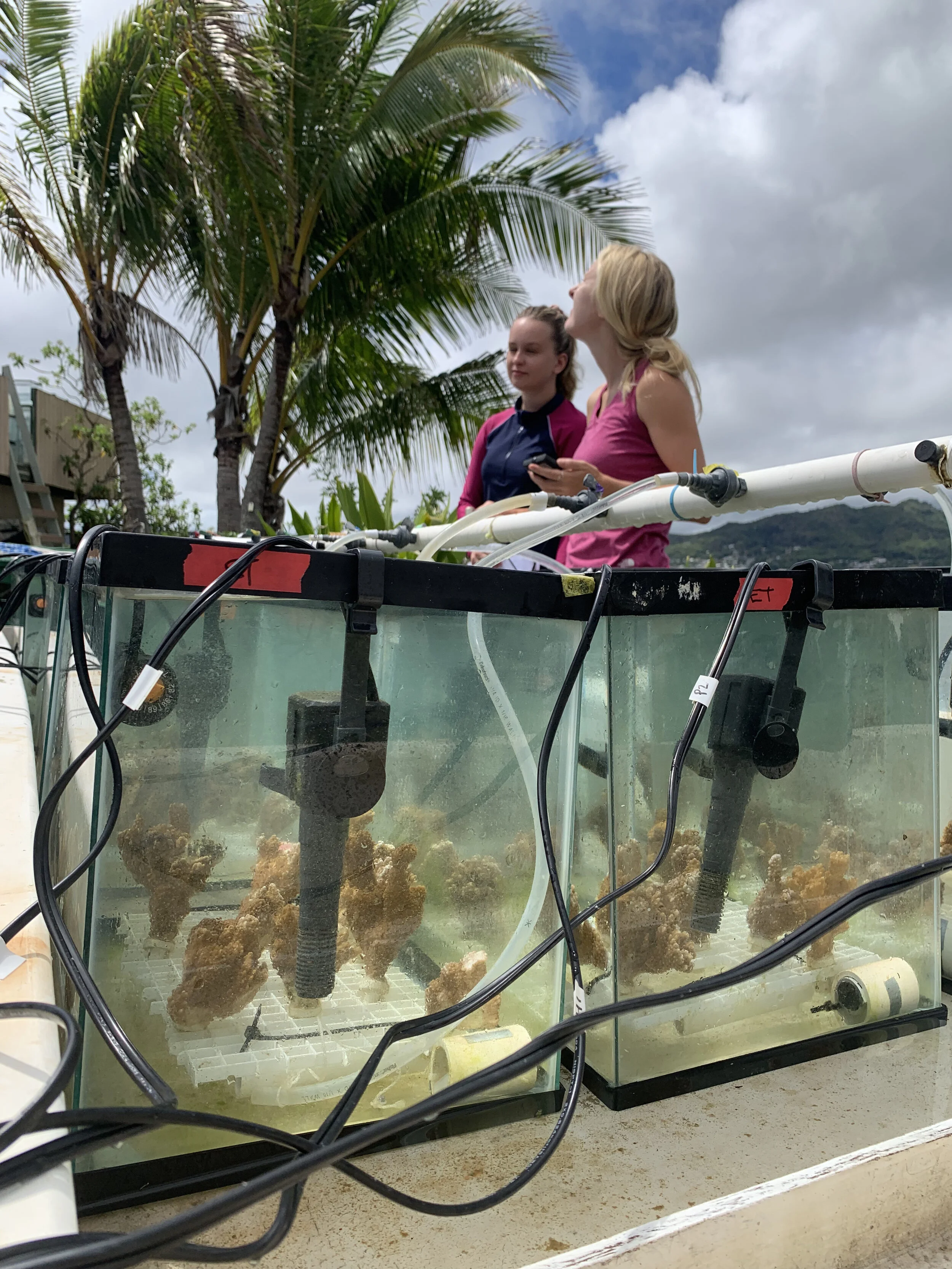 Previous work has shown ocean warming and acidification reduces coral growth and increases coral bleaching (through the loss of algal symbionts); however, responses are not uniform within and between coral species. This suggests some individuals may not be affected by end-of-century climate change scenarios. To gain a better understanding of the future of coral reefs in Hawaiʻi, we conducted a series of laboratory experiments to determine the relative susceptibility of five abundant species including the endemic finger coral (Porites compressa), lace coral (Pocillopora damicornis), rice coral (Montipora capitata), crust coral (Leptastrea purpurea) and mushroom coral (Fungia scutaria) to future climate change conditions.